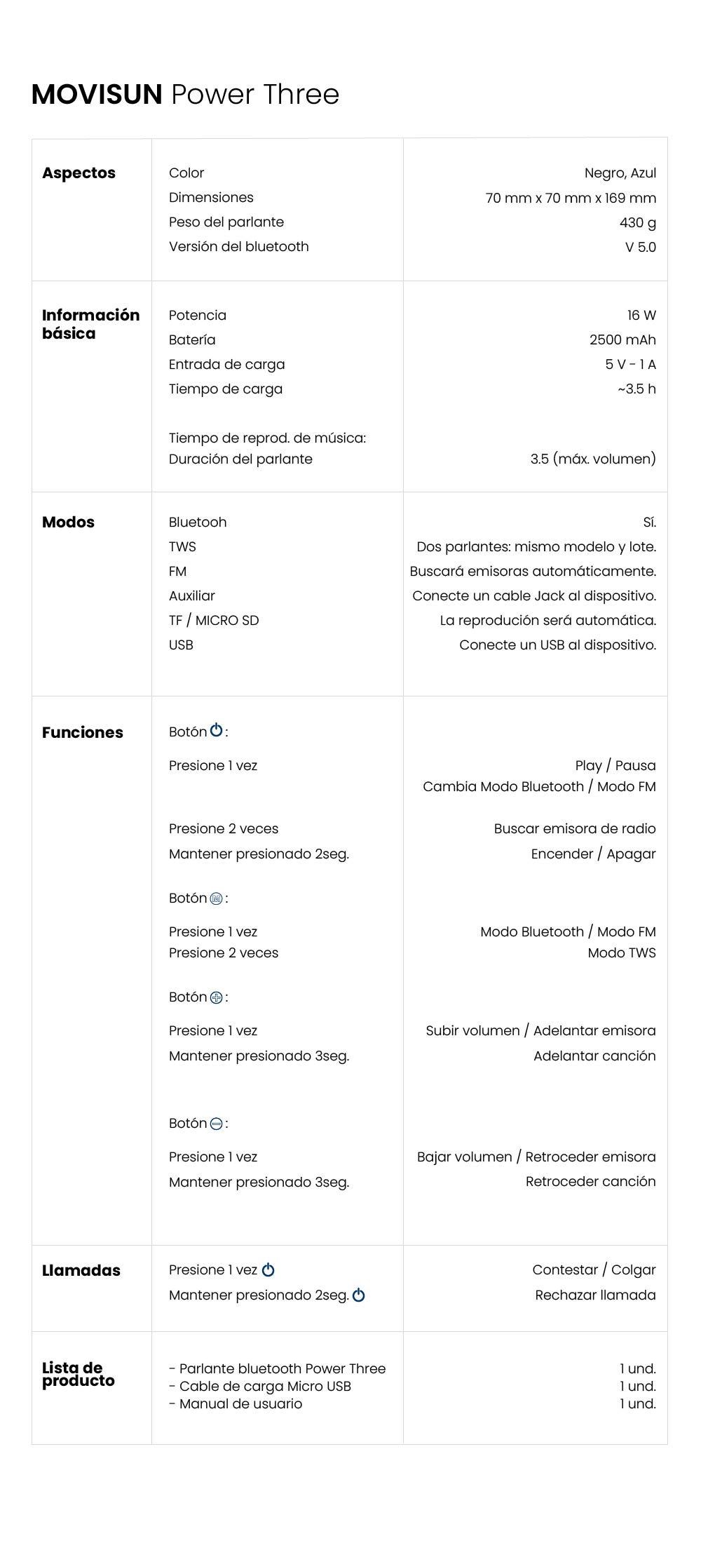 | Modos de reproducción | Bluetooth, USB, Micro SD (TF), Auxiliar, Radio FM |