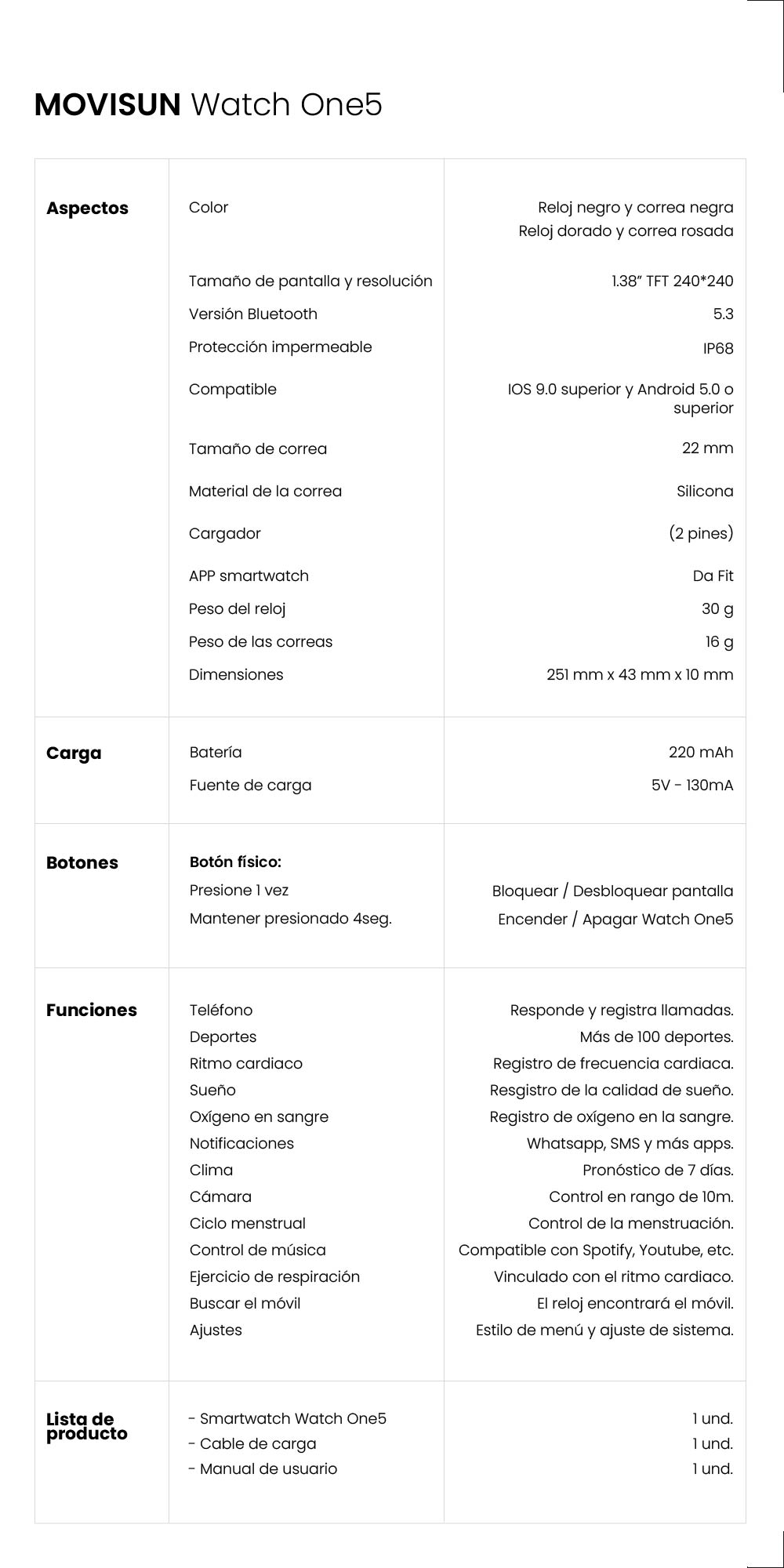 Contenido del paquete | 1x Smartwatch MOVISUN Watch One5, 1x Cable de carga, 1x Manual de usuario |
