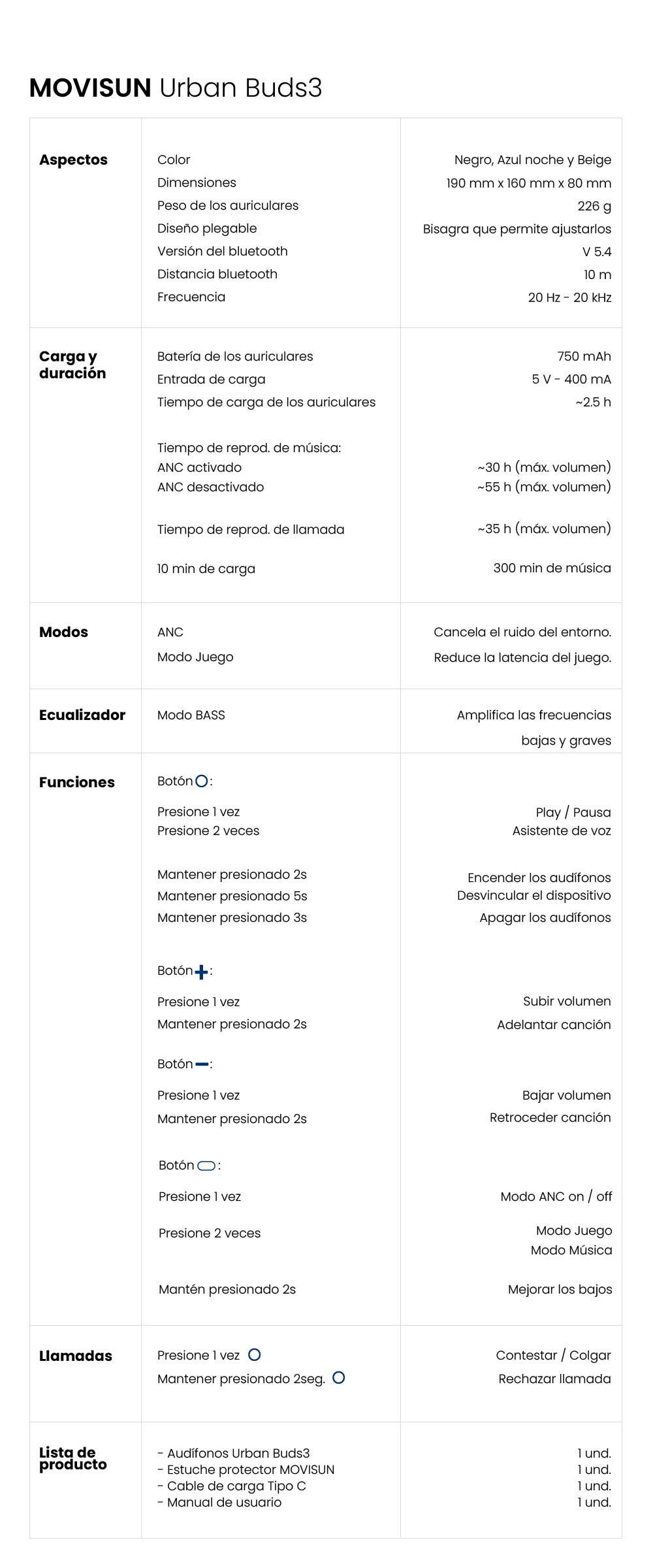 Contenido del paquete | Audífonos Urban Buds3, Estuche protector, Cable de carga Tipo C, Manual de usuario |