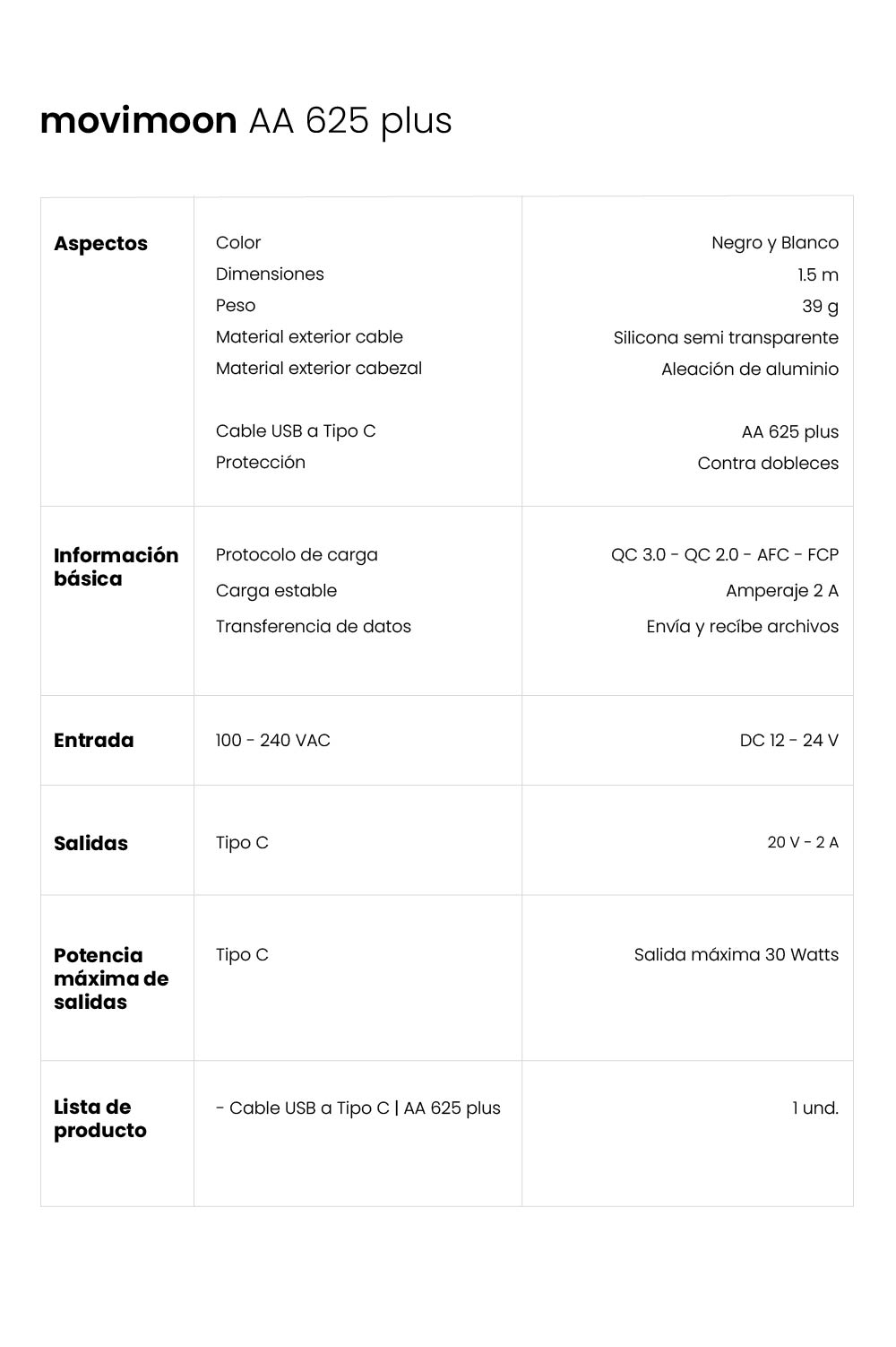 Contenido del paquete | 1 cable USB a USB-C | Modelo: AA 625 Plus |
