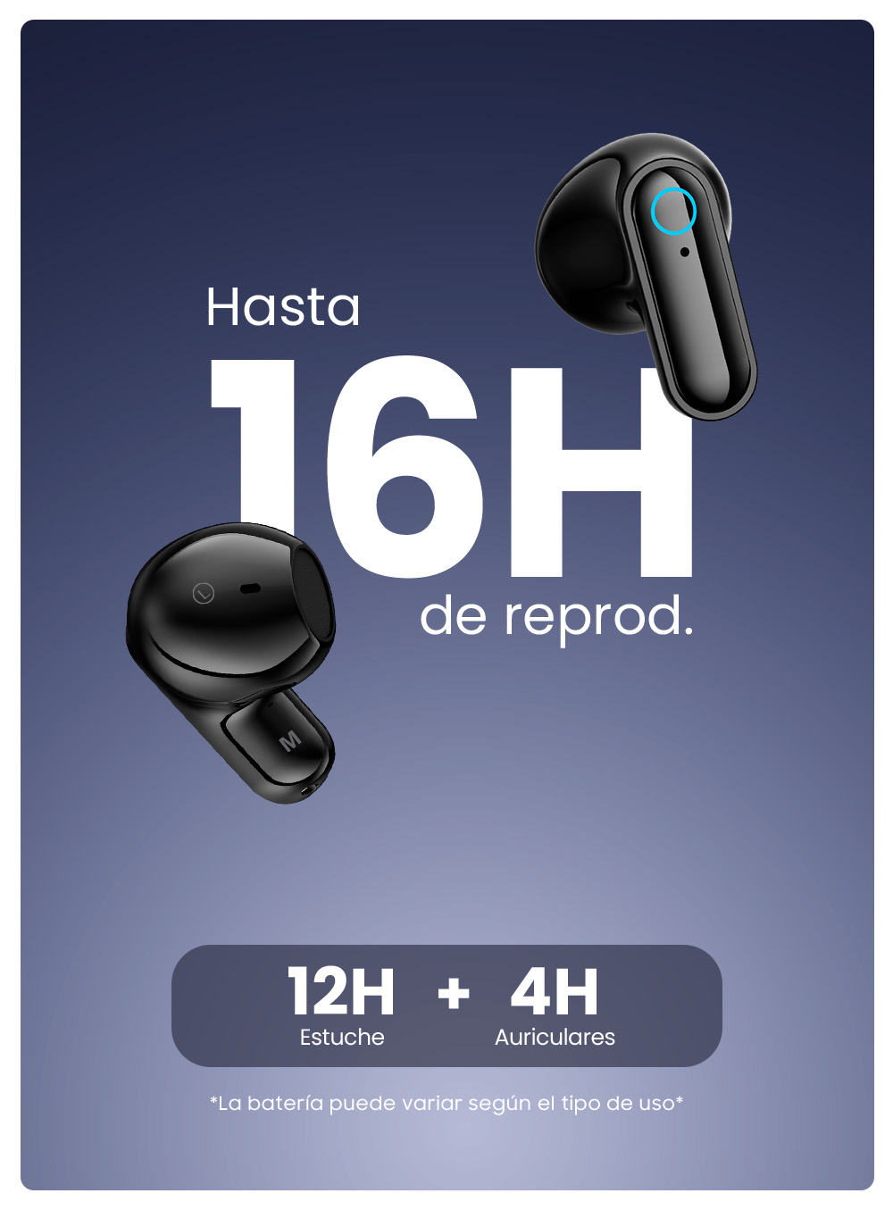 La duración total combinada es de hasta 16 horas: 4 horas por los auriculares y 12 horas adicionales con el estuche de carga.