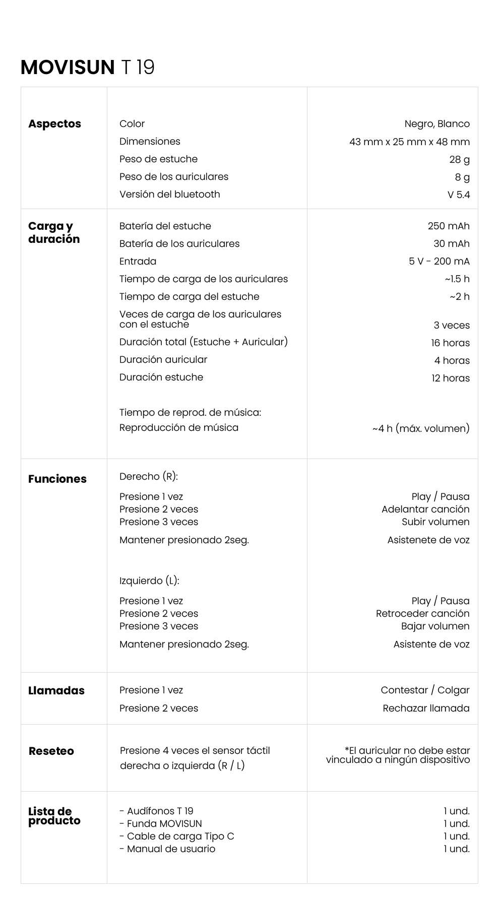 | Contenido del paquete | Audífonos T 19, Funda Movisun, Cable de carga tipo C, Manual de usuario. |