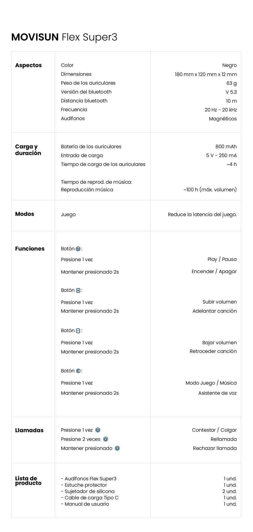 | Contenido del paquete | 1x audífonos Flex Super3, 1x estuche protector, 2x sujetador de silicona, 1x cable de carga Tipo C, 1x manual de usuario |