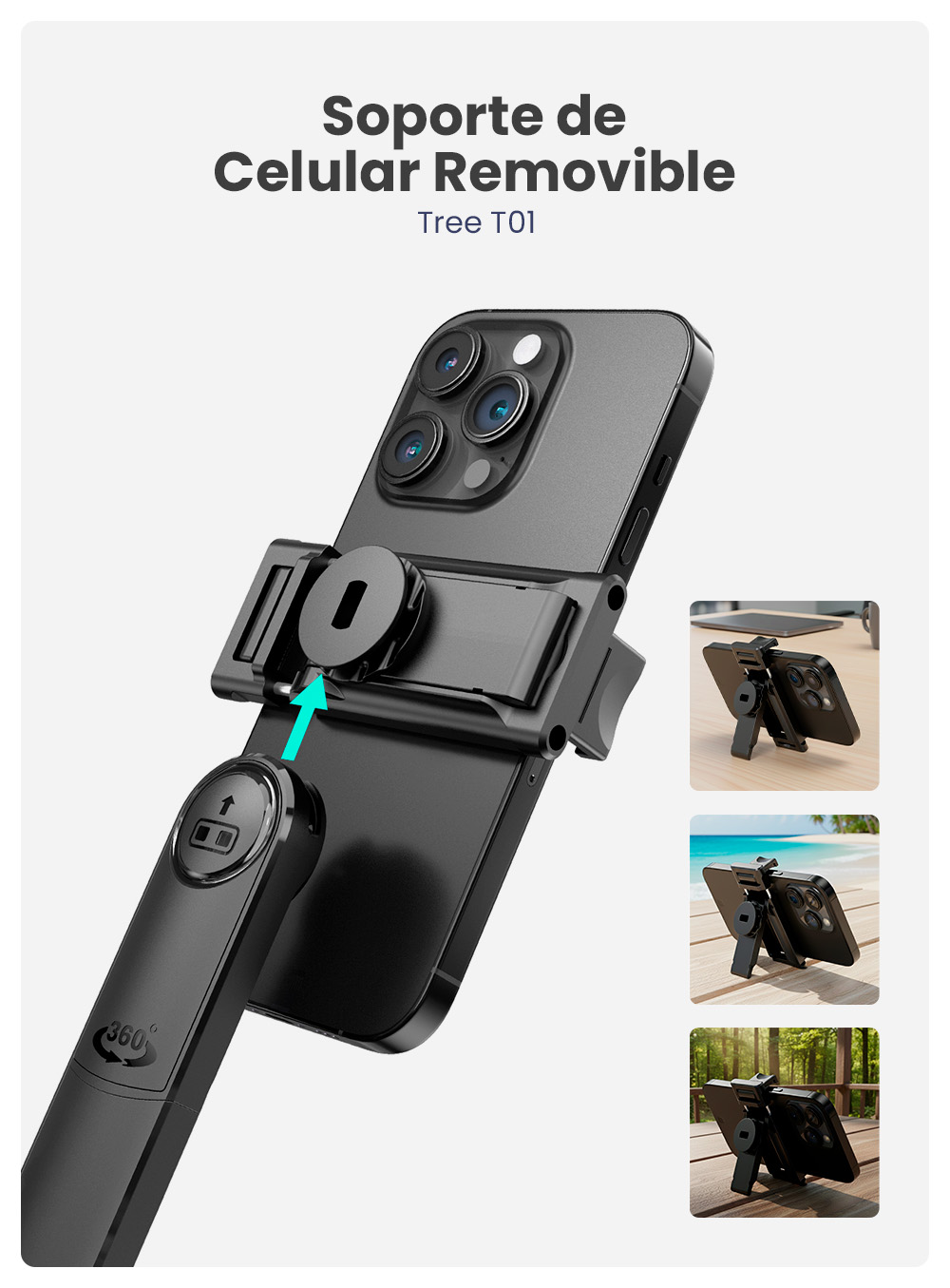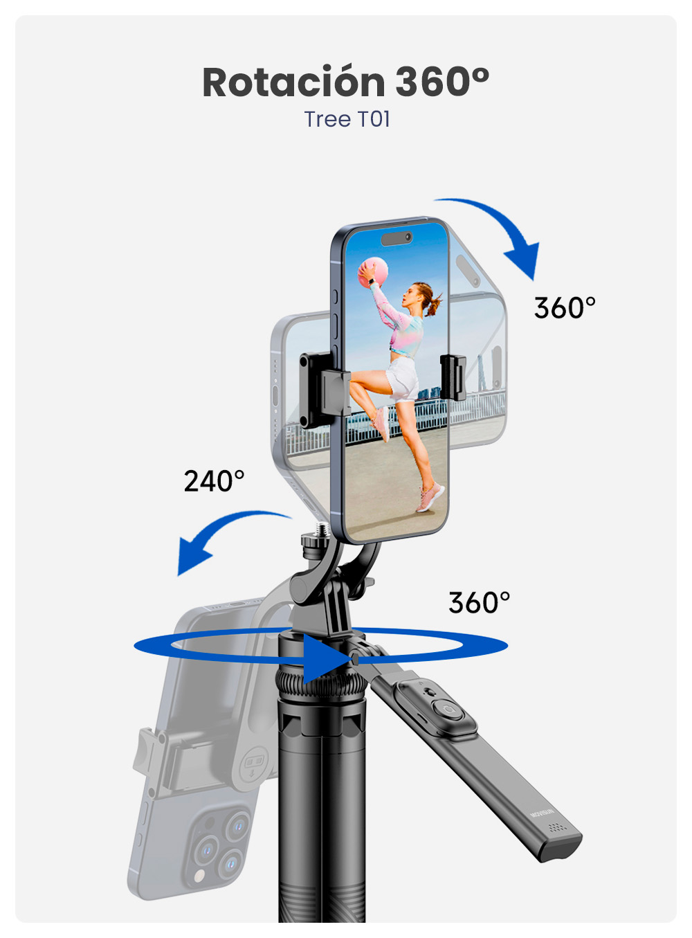 Sí. El soporte de celular gira 360° horizontal y vertical, y el brazo del trípode permite ajuste horizontal.