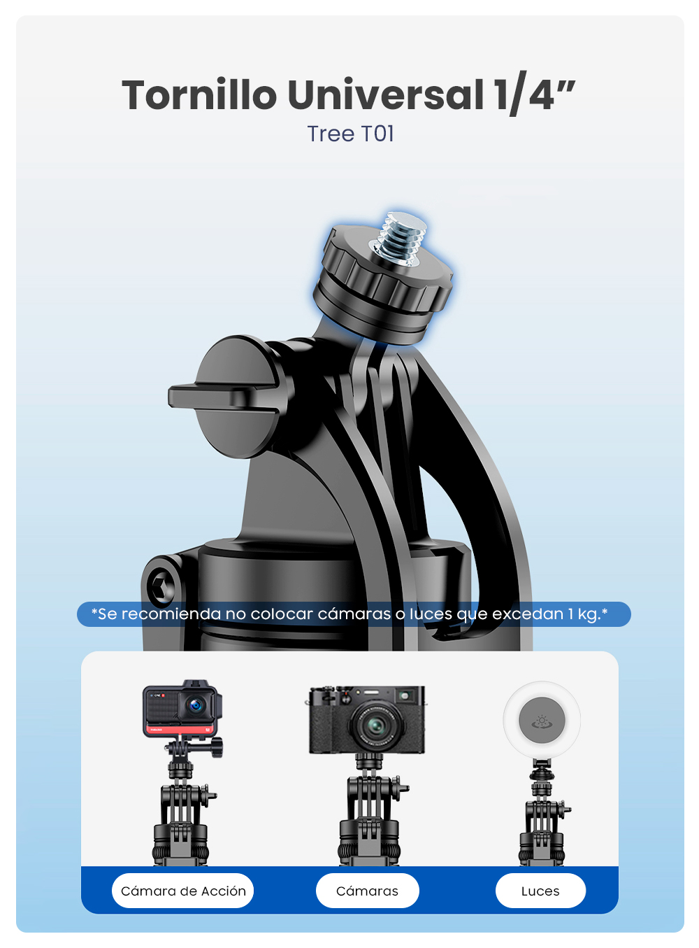 Recomendado para dispositivos de hasta 1 kg. Ideal para celulares, luces de apoyo o cámaras de acción pequeñas.
