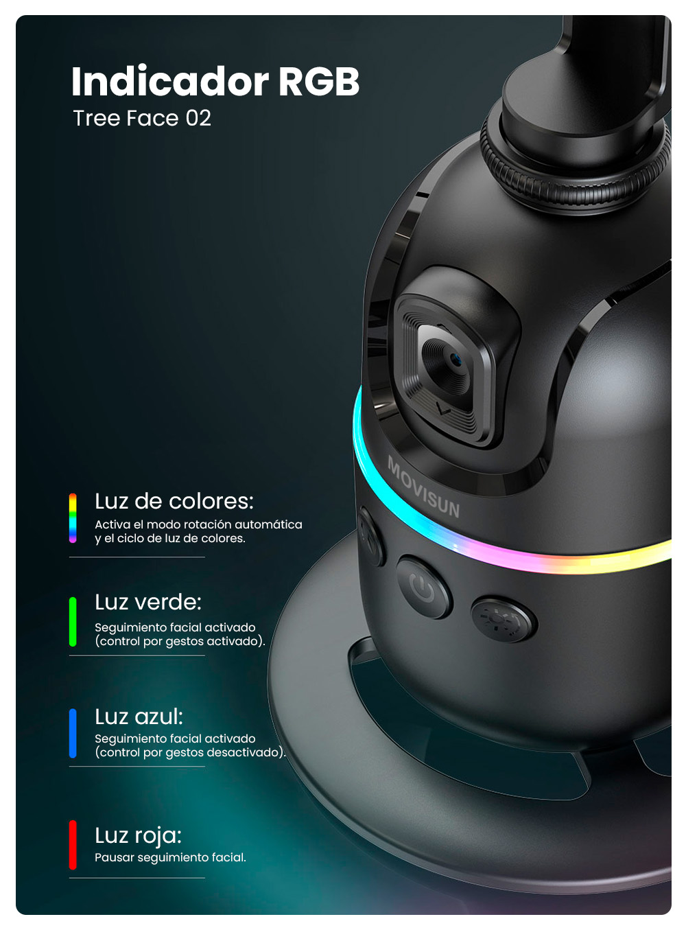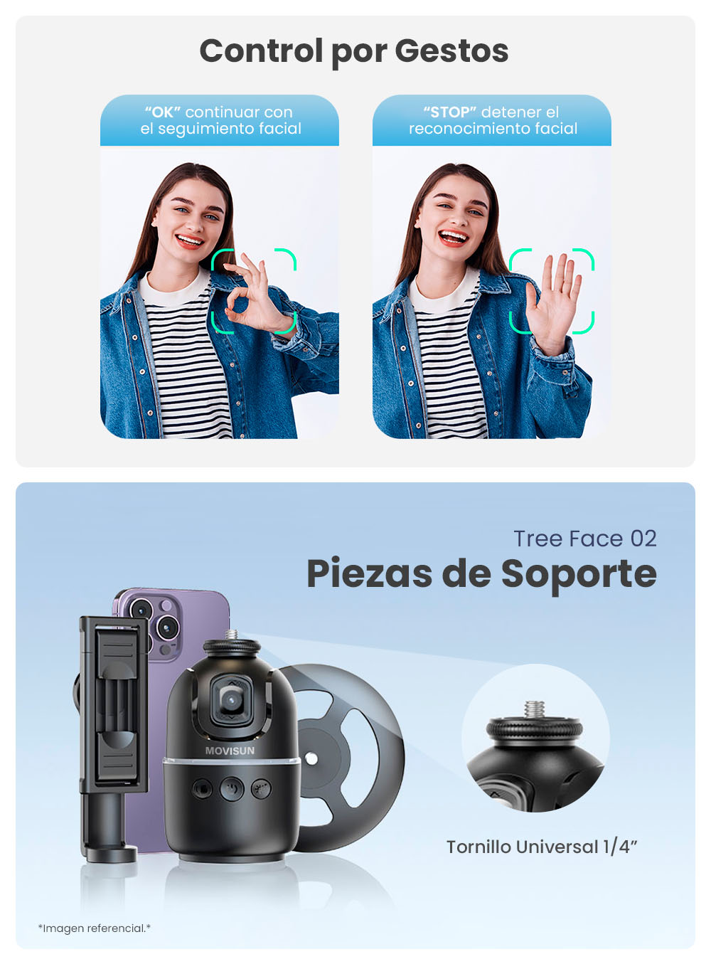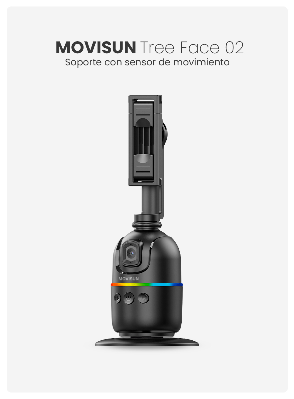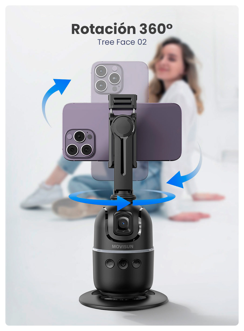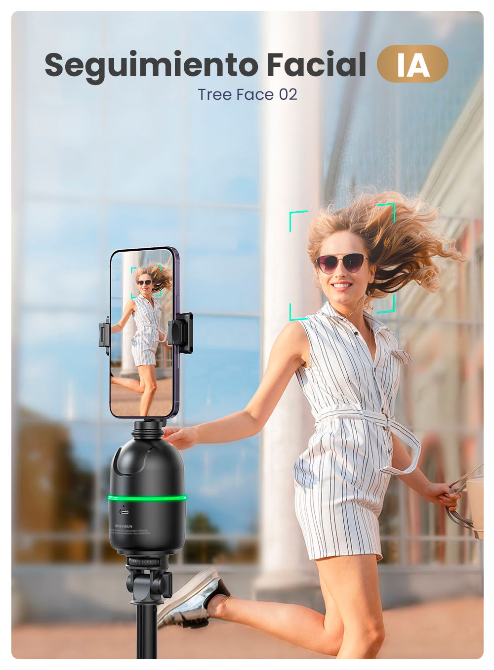 El Tree Face 02 detecta tu rostro y lo sigue automáticamente mientras te mueves, ideal para grabar videos sin usar las manos.