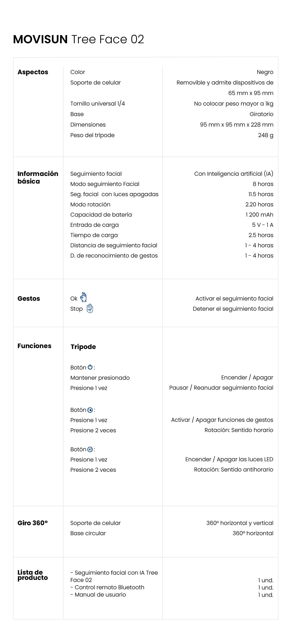 | Contenido del paquete | Soporte Tree Face 02, Base, Cable Tipo C, Manual |