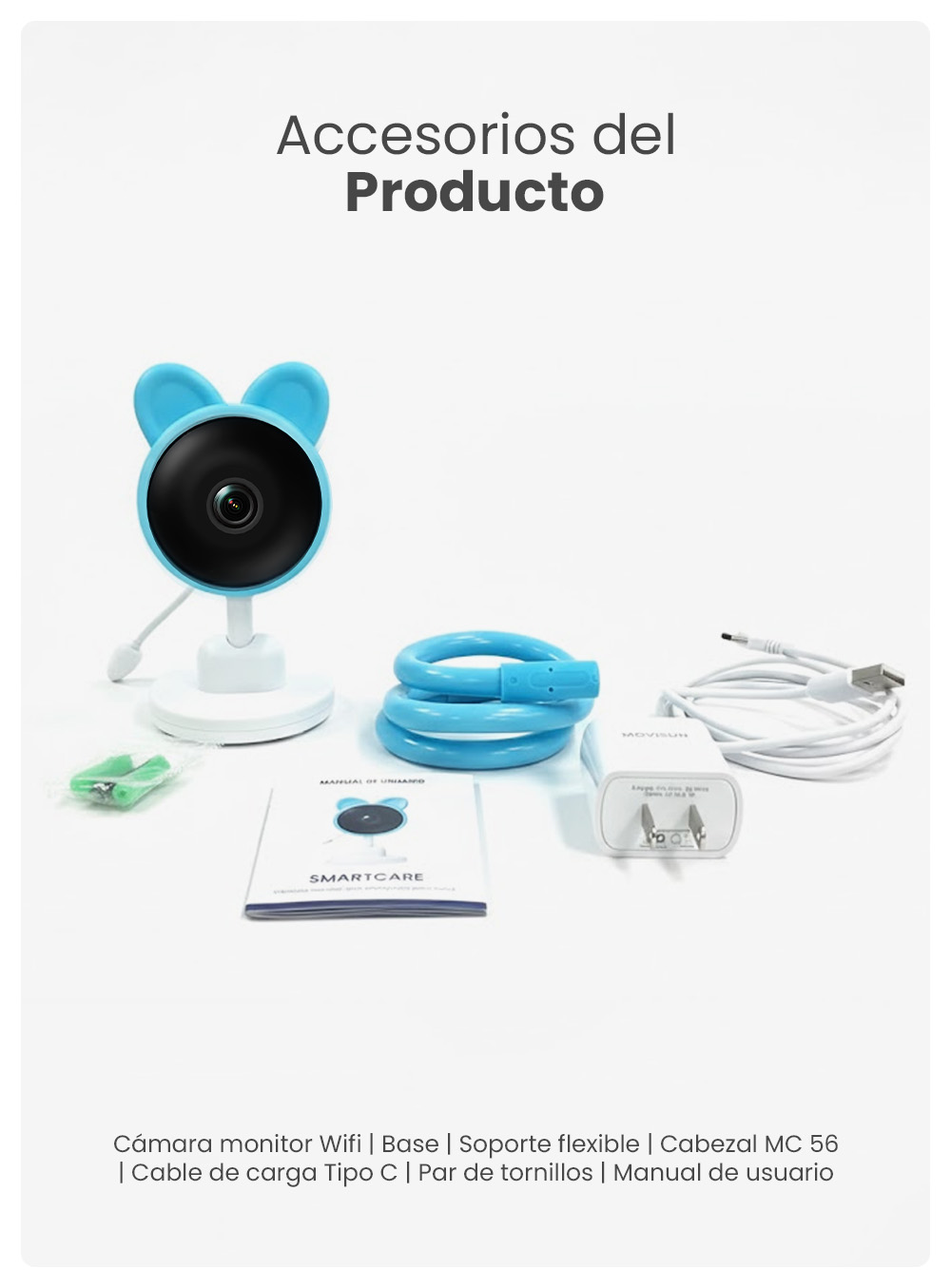 | Accesorios | Soporte flexible, base, cable Tipo C, tornillos, manual de usuario |