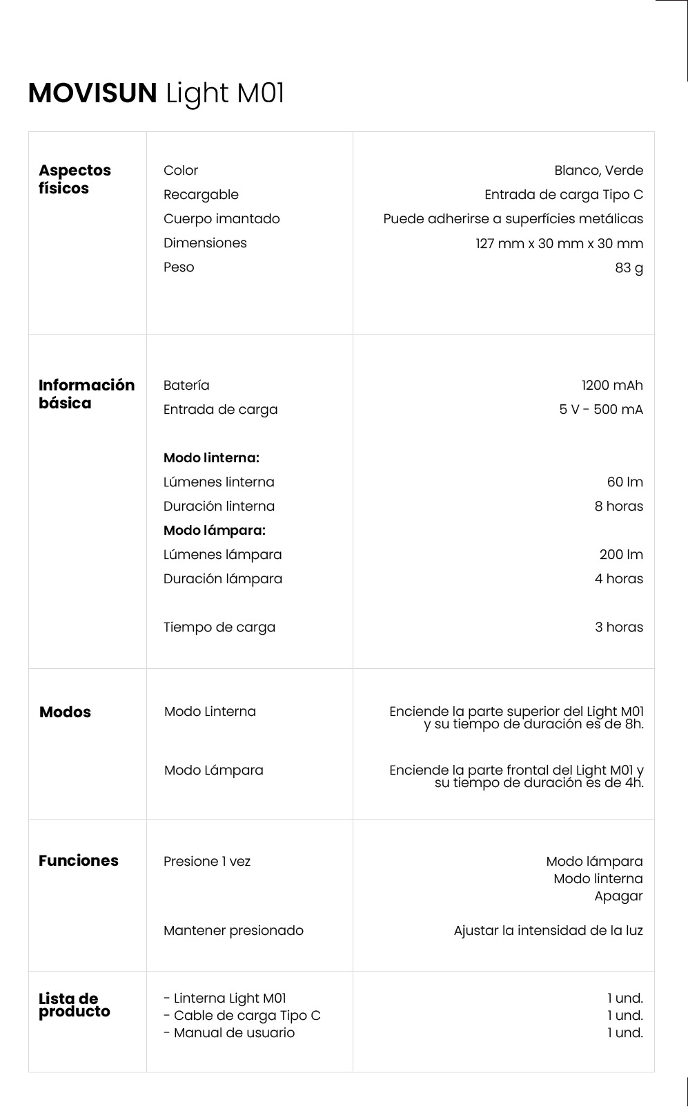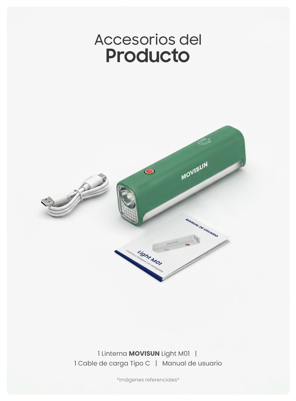 | Contenido del paquete | 1 Linterna Light M01, 1 Cable USB Tipo C, 1 Manual de usuario |