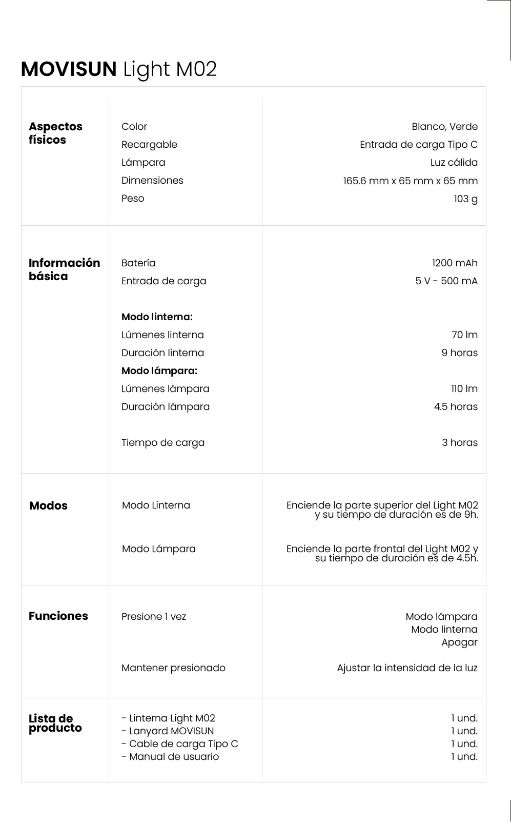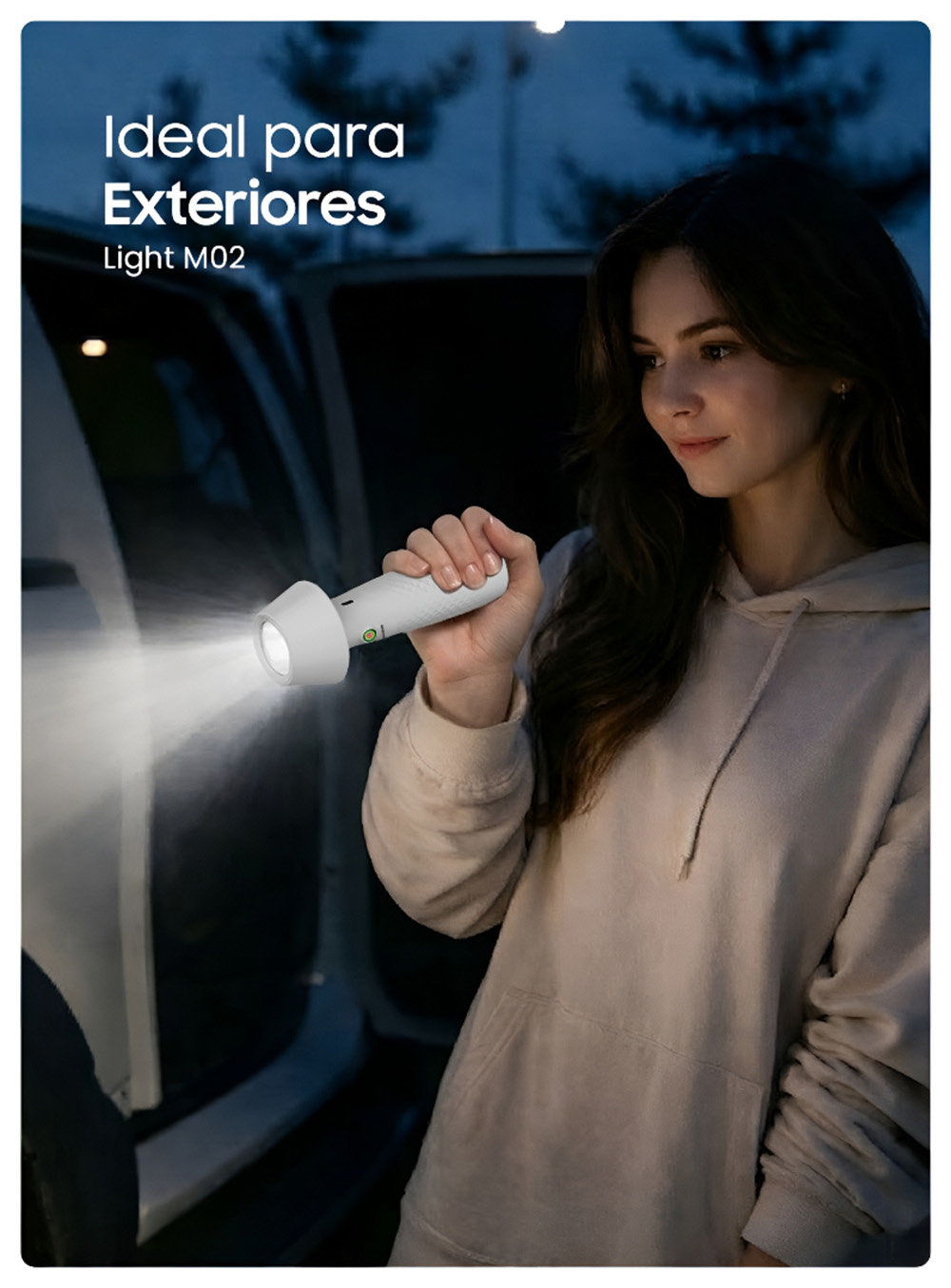 | Contenido del Paquete | 1 Linterna Light M02, 1 Cable Tipo C, 1 Lanyard, 1 Manual de usuario |