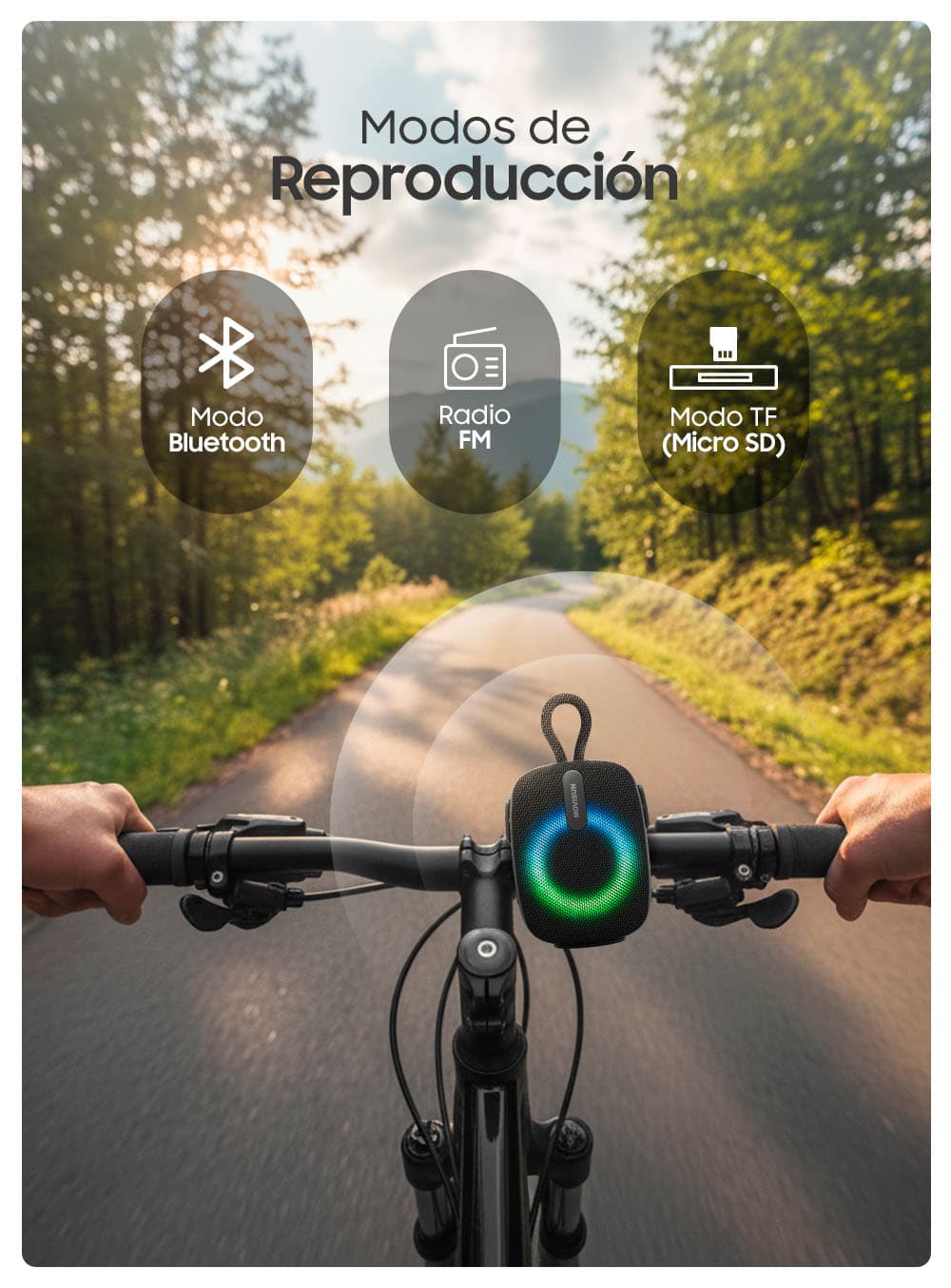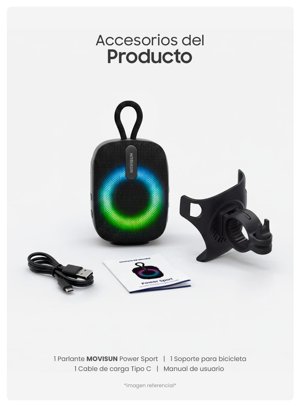 | Contenido del paquete | Parlante, soporte bicicleta, cable Tipo C, manual de usuario |
