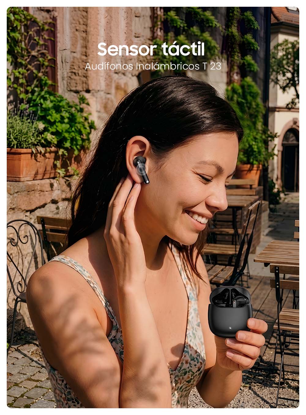 Los T 23 ofrecen hasta 13 horas de uso: 2.5 h por carga de auriculares y 10.5 h adicionales con el estuche cargado.