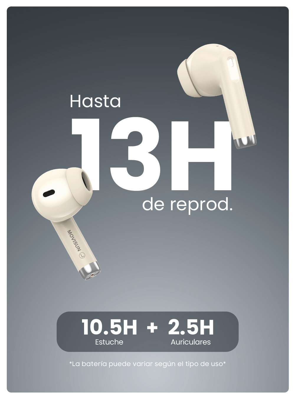 Los T 23 ofrecen hasta 13 horas de uso: 2.5 h por carga de auriculares y 10.5 h adicionales con el estuche cargado.