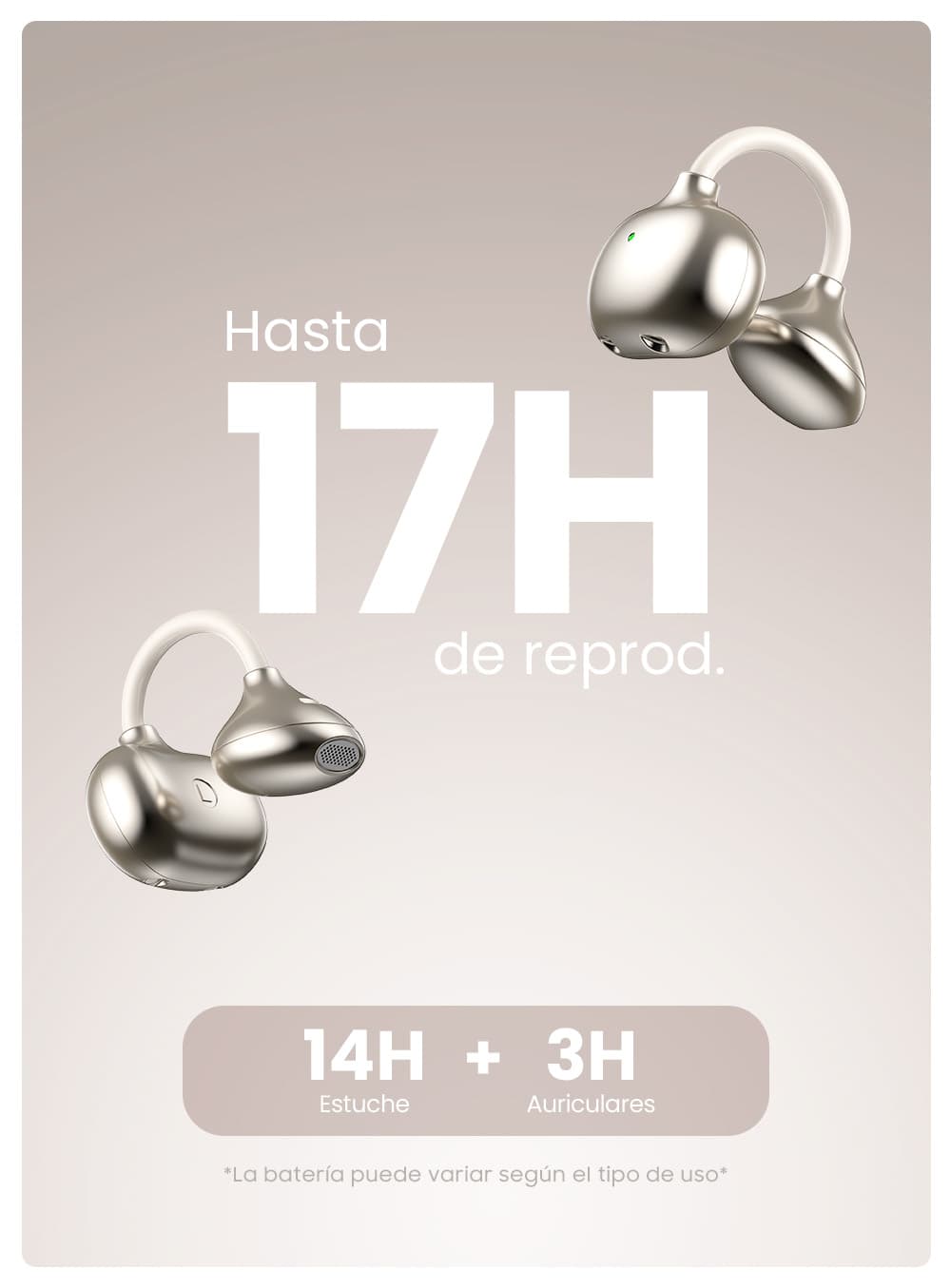 No se insertan en el oído; se colocan por fuera, permitiendo escuchar el ambiente sin aislarte.