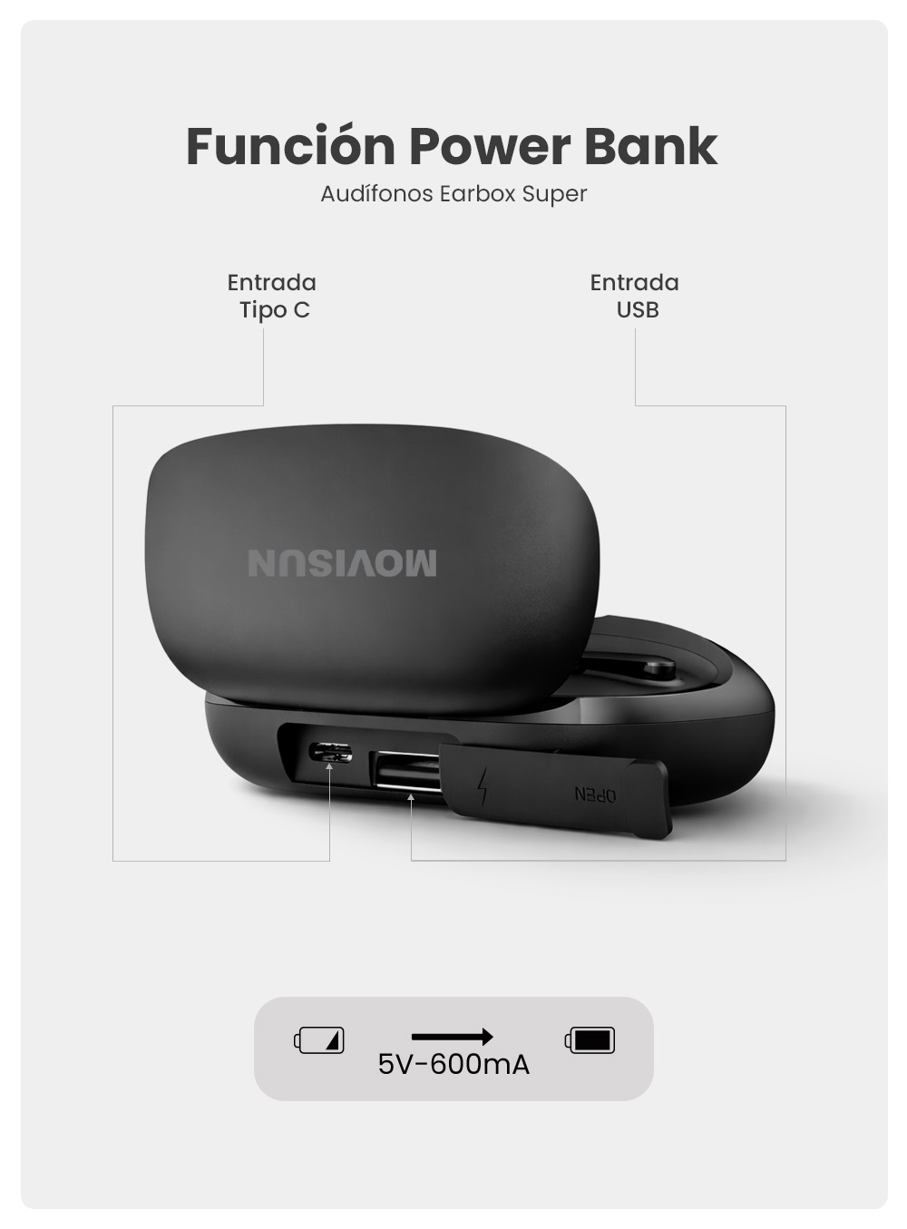 | Contenido del paquete | Auriculares Earbox Super, Funda Movisun, Cable de Carga Tipo C, Manual de Usuario |