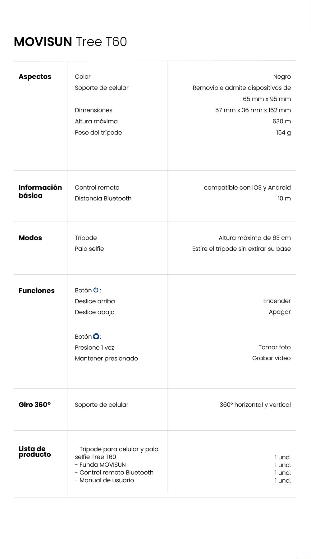 Sí, el Tree T60 funciona como trípode y palo selfie 2 en 1. Solo debes extender el cuerpo del trípode para usarlo en modo selfie.